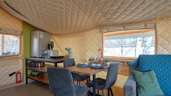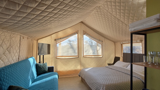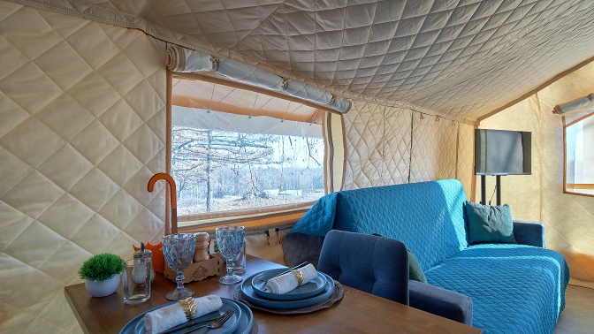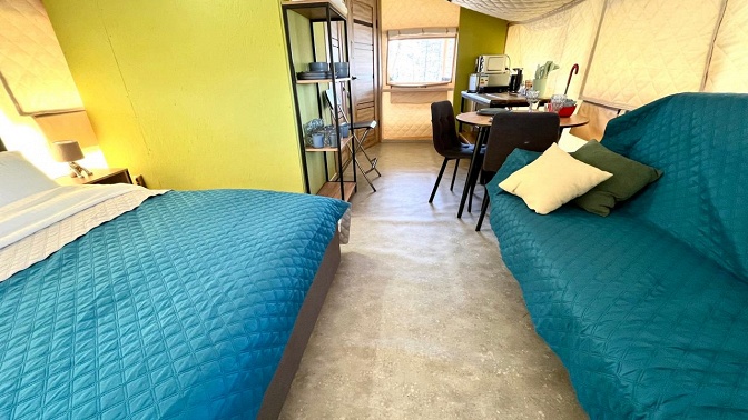 Сафари хаус» — это отдельно стоящий домик площадью 24 кв. м, с санузлом, отоплением, террасой и мангальной зоной для комфортного пребывания гостей до 4 человек. Номер снабжен всем необходимым: двуспальная кровать, диван, ТВ, Wi-Fi, кухонный уголок с плитой, микроволновой печью, чайником и холодильником.